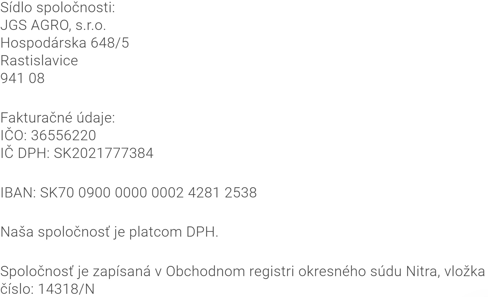 Komu: JGS AGRO s.r.o., Hospodárska 648/5 Rastislavice, 941 08